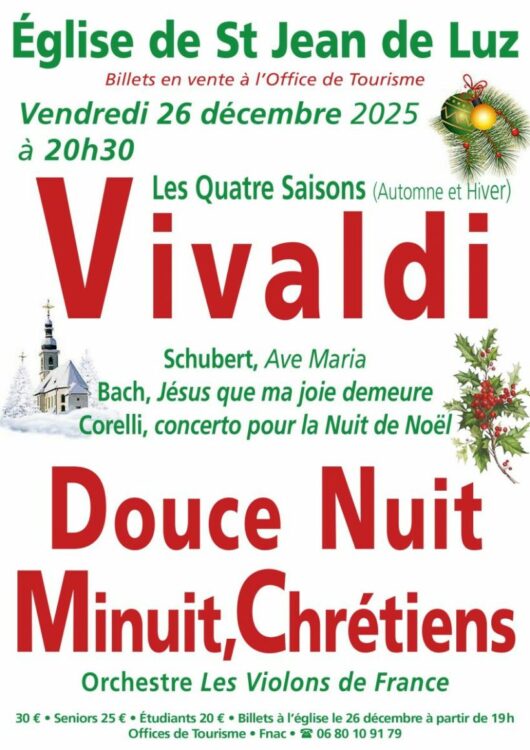 Billets : Office de Tourisme, Fnac ou à l’église 1 heure avant le concert Billets ici : https://boutique.otpaysbasque.com/concerts/concerts-saint-jean-de-luz/concert-les-4-saisons-de-vivaldi-sjdl