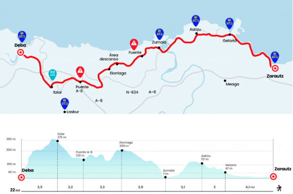 La route N-634 longe l’océan sur 4 kilomètres. Elle relie le célèbre spot de surf de Zarautz au port de Getaria. La chaussée et la promenade s’accrochent à la falaise au-dessus des vagues.